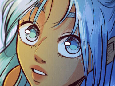 Eyes: Large, pale lilac irises without pupils. Warm, kind.